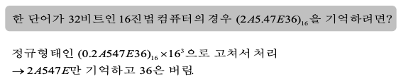 - 모든 실수는 7비트와 8비트 사이에 소수점이 있는 것으로 간주하여 지수값을 변환시켜 기억
