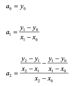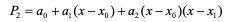 계수 a0, a1, a2를 구하기 위해 P2(x0)=y0, P2(x1)=y1, P2(x2)=y2이므로 다항식에 대입하면 다음과 같음.