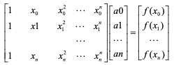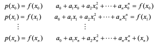 보간 다항식을 p(x) = a0+a1*x+a2*x^2+⋅⋅⋅+an*x^n라고 하면 주어진 점에서 다음과 같은 관계가 성립