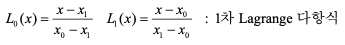 위 두 다항식을 이용하여 두 점 (x0,y0)와 (x1,y1)을 지나는 1차 다항식은 다음과 같음.