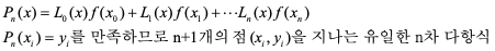 결국 서로 다른 (n+1)개의 점 x0, x1, x2,⋅⋅⋅,xn에 대해서 함수 f(x)와 함수 값이 같은 n차 이하의 다항식 Pn(x)는 다음과 같음.