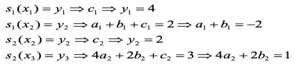 - 다음과 같이 4개의 데이터가 주어졌을 때, 2차 스플라인을 구하기 위해 다음과 같은 다항식을 이용