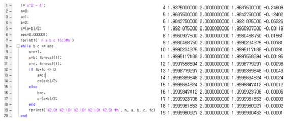 f(x)=x^2-4 의 근사해를 [0,5]에서 이분법으로 구하여 보자