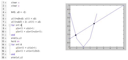 - 곡선의 교점은 하나는 -2와 -1 사이에 있고, 다른 하나는 1과 2사이에 존재함. 그러므로 시작점으로는 -1과 2.
