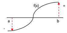 구간 (a, b)에서 연속인 함수 f(x)가 주어지고 f(a)와 f(b)가 반대부호를 갖는다고 가정하자.