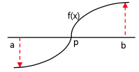 중간 값 정리에 의하여 f(p) = 0을 만족하는 점 p가 a와 b사이에 존재함.