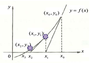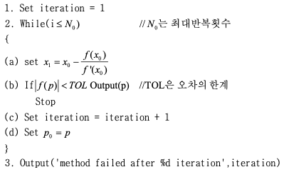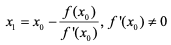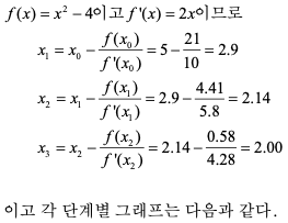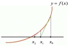 위의 그림에서와 같이 초기값 x0에 대응하는 점 (x0 , f (x0))에서 함수 f(x)의 접선방정식은 y= f'(x0)(x-x0)+f(x0)이고 이 직선이 x축과 만나는 점 x1은 다음식을 만족