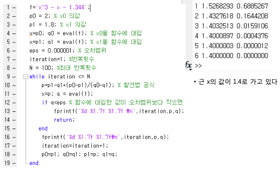 f(x) = x^3-x-1.344=0의 근을 x0=2, x1=1.8을 사용하여 할선법으로 매트랩을 이용하여 구하라.