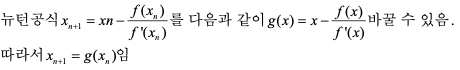 여기서 고정점이란, 어떤 점 x가 g(x)=x를 만족할 때 x를 g(x)의 고정점이라 함.