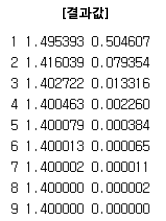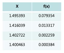9번 만에 근의 값이 1.4로 수렴하는 것으로 보아 뉴턴법보다는 수렴속도가 느린 것을 알 수 있다.