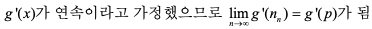 반복함수 g(x)가 미분 가능하고 그 도함수 g '(x)가 연속이라고 가정, 또한 x0로부터 시작해서 반복법으로 수열 x1, x2,⋅⋅⋅을 얻고 이 수열이 한 점 p로 수렴한다고 가정하면 이 점 p가 g(x)의 고정점