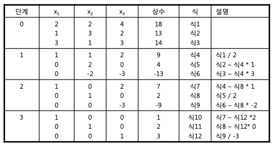 - 방정식 (1)과 (3)을 바꿔 가우스 소거법을 적용