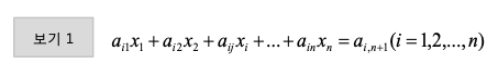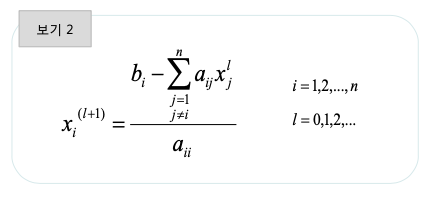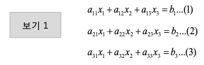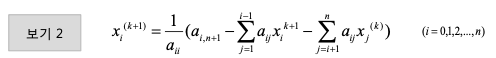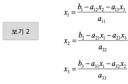 - 해를 구하기 위해서 보기 1의 방정식(1)를 x1에 대해서 (2)를 x2에 대해서, (3)를 x3에 대해서 보기 2와 같이 품.