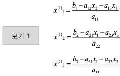 x1^(0), x2^(0), x3^(0) 값을 보기 1에 대입하여 x1^(1), x2^(1), x3^(1) 를 구함.