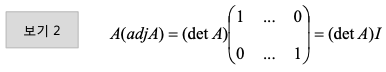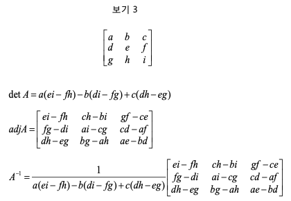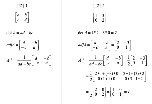 - 보기 2와 같이 detA가 0일 경우 역행렬이 존재하지 않음.