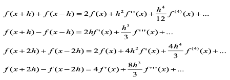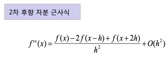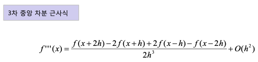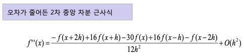 - 1차 전방차분 및 후방차분 근사식을 줄이기 위해 x+h와 h+2h 혹은 x-h와 h-2h를 사용