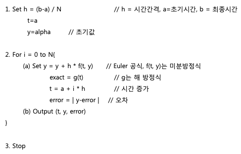 강그리고 양의 정수 N에 대해 오일러 방법으로 근사값 w0, w1, ..., wN을 얻었다고 하면 f가 리프시츠(Lipschitz) 상수 L에 대해 집합