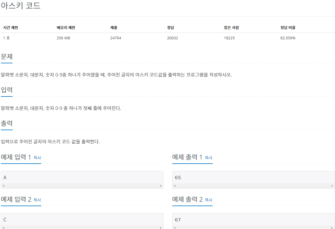 알고리즘/백준 아스키 코드 슈도코드 2019. 10. 7. 20:19 #include <iostream> using namespace std; int main() { char a; cin >> a; cout << static_cast<int>(a) << '\n'; return 0; } 공유하기 게시글 관리 pSeudoCode '알고리즘 > 백준' 카테고리의 다른 글 문자열 반복 (0) 2019.10.10 숫자의 합 (0) 2019.10.08 하노이 탑 이동 순서 (0) 2019.10.06 별 찍기 - 10 (0) 2019.10.04 팩토리얼 (0) 2019.10.03 '알고리즘/백준' Related Articles 문자열 반복 숫자의 합 하노이 탑 이동 순서 별 찍기 - 10
