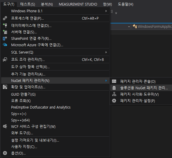 도구 -> NuGet 패키지 관리자 -> 솔루션용 NuGet 패키지 관리 클릭