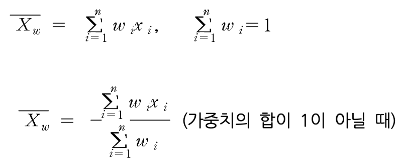 가중평균은 각 관측치에 대한 가충치가 다를 때 평균을 구하는 방법. 가중치의 총합이 1이 되는 경우 가중평균은 단순히 개별 관측치와 가중치를 곱한 값을 모두 더해서 구해짐. 가중치의 합이 1이 아닌 경우 개별 관측치와 가중치를 곱한 값을 모두 더한 후 가중치의 총합으로 나누면 가중평균을 구할 수 있음.