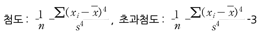 정규분포를 기준으로 하는 상대적 첨도를 초과첨도(excess kurtosis)라고 하는데 첨도의 식에 서 3을 빼서 구함. 따라서 정규분포일 경우 초과 첨도는 0이며 정규분포보다 뾰족한 경우 초과첨도는 양수, 반대의 경우에는 음수.