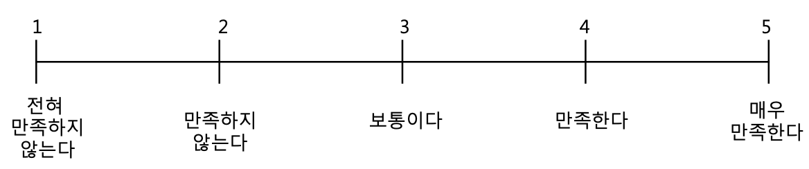 • 5점과 7점은 홀수이므로 중앙값이 "보통"을 의미하여 중앙값에 몰리게 되므로 짝수인 4점/6점 척도를 사용하는 경우도 있음
