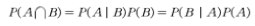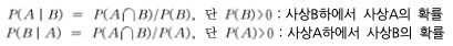 베이지안 법칙(Bayes’ formula)을 적용하면 사후적 확률을 구할 수 있음. P(A)는 미리 주어진 사전적 확률(prior probability)이지만 사상 B라는 새로운 사건이 실제로 발생하였다면 P(A|B)의 사후적 확률(posterior probability)을 구할 수 있다.