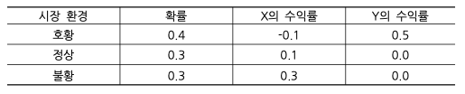 주식 시장 환경을 호황, 정상, 불황으로 나눌 때 각각의 경우에서 두 주식 X, Y의 수익률 이 다음과 같을 때 공분산과 상관계수를 구하고 의미를 해석하라.