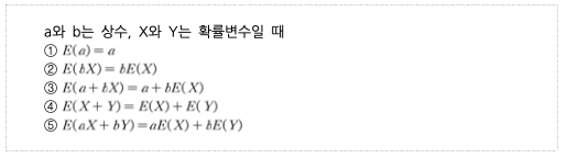 확률변수의 기댓값은 1차식으로 도출되기 때문에 다음과 같은 특성을 가짐. 확률변수를 선형적으로 변화시킬 경우 기댓값 또한 선형적으로 변화.