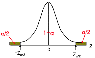 표준정규분포를 사용하여 100(1- α)%의 신뢰구간을 설정하는 경우라면 다음과 같은 그림으로 신뢰구간을 나타낼 수 있음.