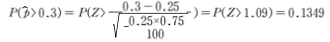 <예제> K은행과 L정보통신은 휴대폰으로 은행 업무를 볼 수 있는 서비스를 제공하고 있다. 고객 확보를 위해 무상으로 단말기를 지급한다고 할 때 L정보통신으로 이동 가입하려는 고객 은 잠정적으로 25%일 것으로 추정된다. 다른 정보통신 가입자 중에 K은행 고객인 100명을 대상으로 30명 이상이 L정보통신으로 이동할 확률은?