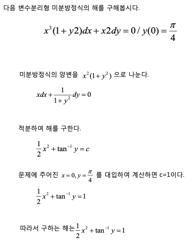 - A(x)dx+b(y)dy=0와 같은 형태의 미분방정식은 항별로 적분하여 풀이